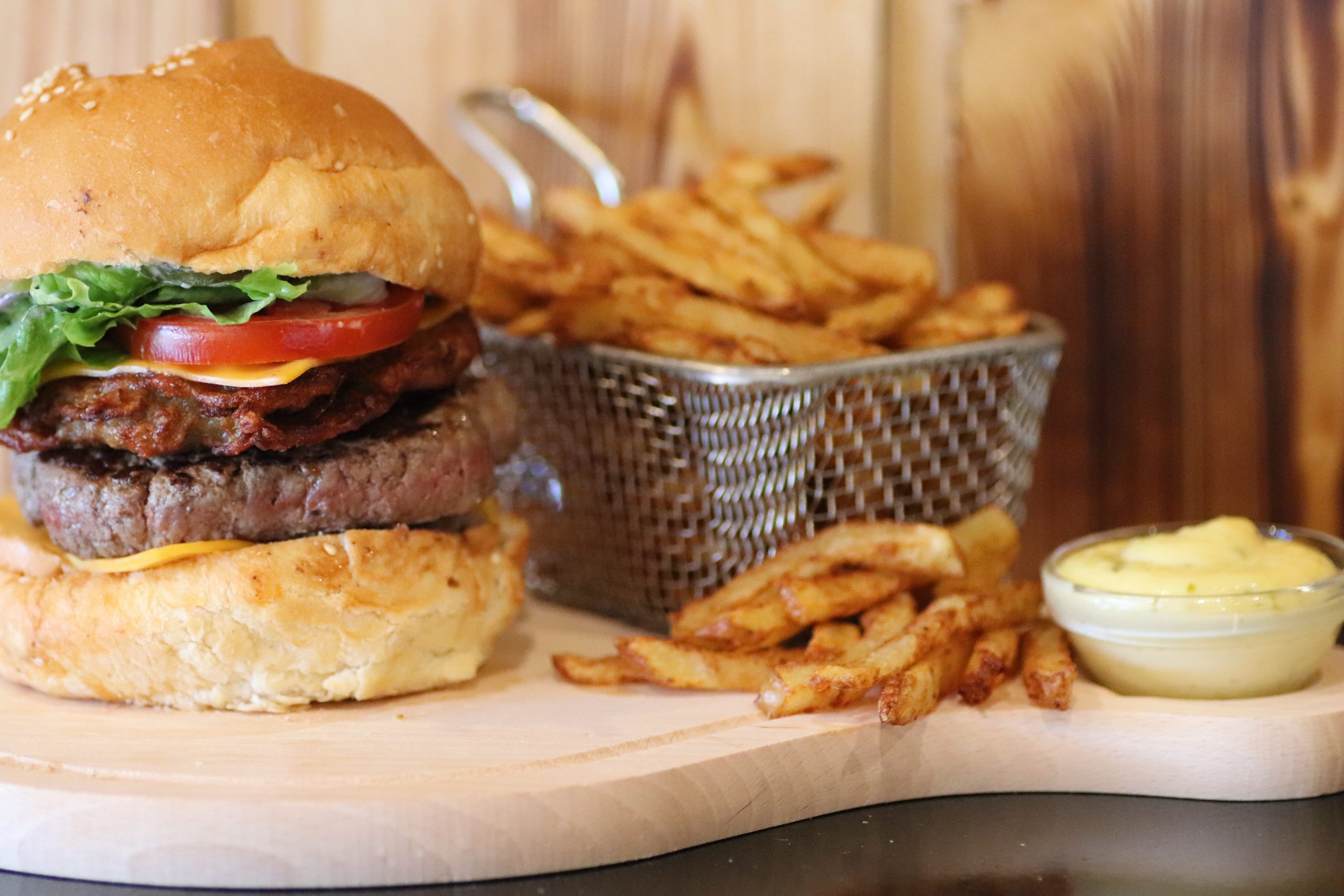 Maxi steak, galette de pomme de terre maison, double cheddar, crudités