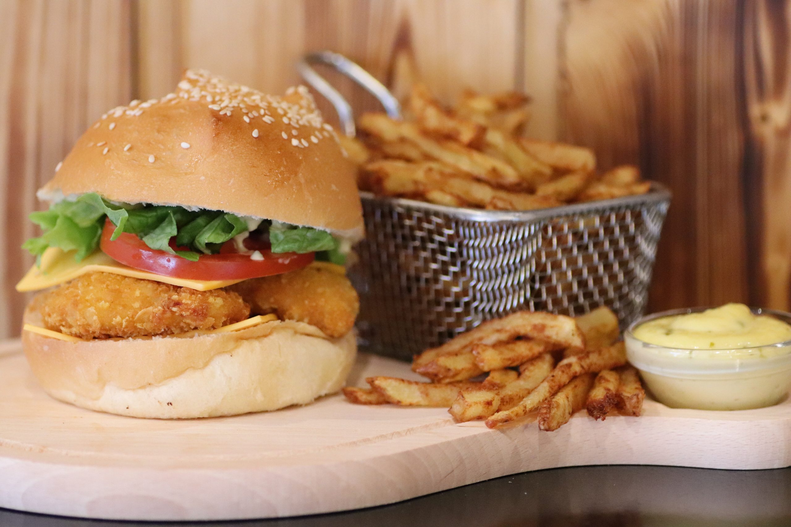 Filets de poulets, double cheddar, crudités