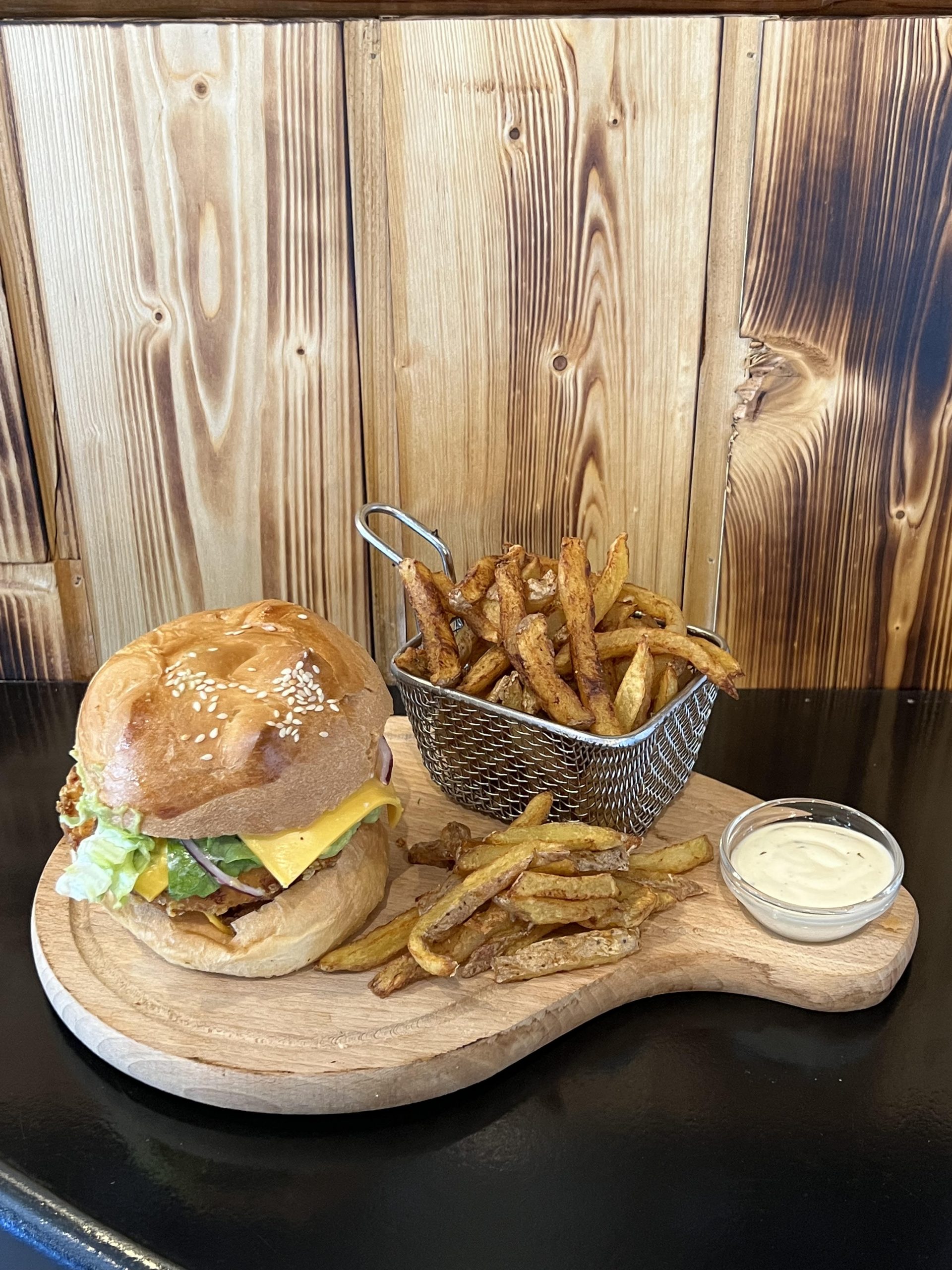 Poulet croustillant, crème avocat, basilic, cheddar, salade, oignons rouges