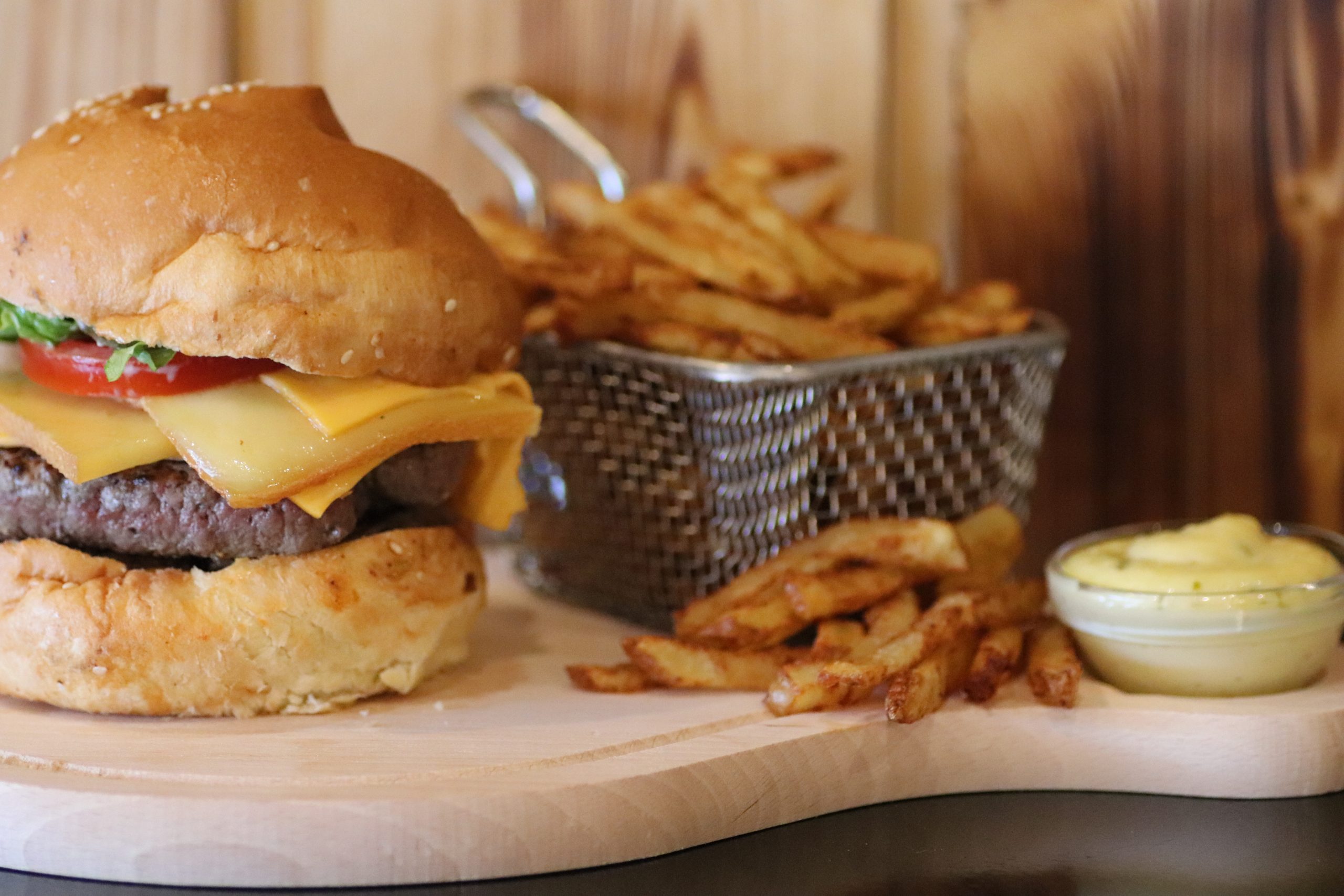 Maxi steak, fromage raclette, double cheddar, crudités
